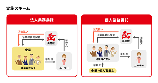 また、新型コロナウイルス感染症拡大の影響で、今までと同等の雇用維持が難しく、余剰人員を抱えている企業に対して「従業員雇用シェア」も実施した。空いた業務時間を活用して従業員に配達員として稼働してもらい、稼働した時間分の賃金を雇用企業ではなく出前館の業務委託費用から支払う。