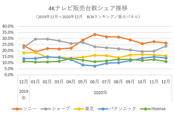 販売台数シェアでは、12月もソニーが首位をキープ。ただ、2位のシャープが追い上げており、2.5ポイント差まで縮まっている。3位~5位は東芝、パナソニック、ハイセンスが僅差で競り合う展開だ。