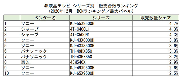 シリーズ別の販売台数ランキングでは、メーカーシェアトップのソニー「KJ-55X9500H」が首位。前月は「KJ-43X8000H」がトップだったが、12月はさらに大型のモデルが販売を伸ばした。一方、トップ争いを繰り広げるシャープは、「4T-C40CL1」が2位、「4T-C50CN1」が3位にランクイン。シェア差はわずかで、21年も両社が市場をけん引することになりそうだ。(BCN・大蔵大輔)