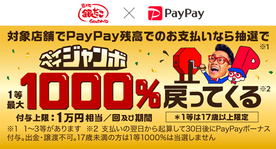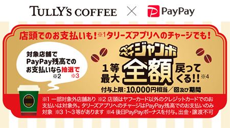 PayPayは、1月8日に築地銀だこで「ペイペイジャンボ」を開始。1等が1000%、2等が100%、3等が5%還元と、還元率が高いのが特徴だ。還元上限は1万円/回・期間。1月21日まで開催している。また、ペイペイジャンボは、1月15日にタリーズでもスタートした。こちらは、1等が100%、2等が10%、3等が2%還元で、還元上限が1万円/回・期間。期間は1月31日まで。