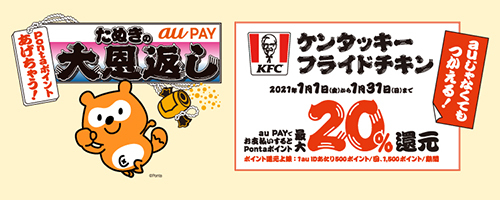 au PAYは、12月から行っている「たぬきの大恩返しキャンペーン」を1月も継続。対象店舗には、新たにケンタッキー・フライドチキンとスーパーマーケットが設定されている。還元率はどちらも20%で、還元上限がケンタッキーが1au ID当たり500ポイント/回、1500ポイント/期間、スーパーが1au ID当たり500ポイント/回、3000ポイント/月。期間は、ケンタッキーが1月31日まで、スーパーが3月22日まで。