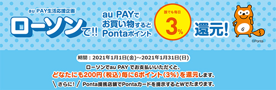 昨年に引き続き、ローソンでのお得な施策も実施している。「ローソンで!! au PAYでお買い物するとPontaポイント誰でも毎日3%還元」を1月31日まで開催しており、お得に買い物ができる。auポイントプログラムや三太郎の日などで還元率が上がるチャンスも見逃せない。