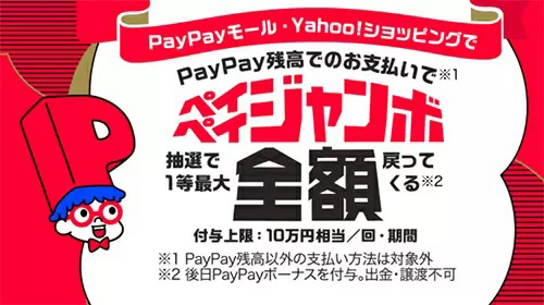 スマートフォン決済サービス「PayPay」は、ECサイト「PayPayモール」と「Yahoo!ショッピング」を対象に、「ペイペイジャンボ」を開催している。期間は2月28日まで。期間中、対象ストアでPayPay残高で支払った際に抽選を実施し、当選者には会計金額の最大100%分(上限10万円相当)のPayPayボーナスを付与するキャンペーンだ。