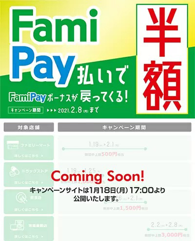 ファミリーマートは、バーコード決済機能付きの公式アプリ「ファミペイ」内の決済機能「FamiPay」が使える店舗でFamiPayで支払うと、支払金額の半額相当をFamiPayボーナス(FamiPayに自動的にチャージ可能なポイント)で進呈するキャンペーン実施を予告している。キャンペーン期間は1月19日~2月8日で、詳細を1月18日17時に公開する。