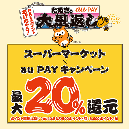 まず、押さえておきたいのが12月にスタートした「たぬきの大恩返しキャンペーン」だ。1月の対象店舗はケンタッキー・フライドチキンとスーパーマーケット。還元率はどちらも20%で、還元上限は、ケンタッキーが1au ID当たり500ポイント/回、1500ポイント/期間、スーパーが1au ID当たり500ポイント/回、3000ポイント/月。