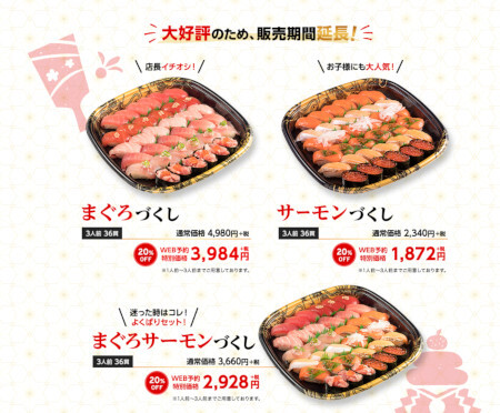さらに、大好評で販売期間を延長しているのが、大人に人気の「まぐろづくし」、子どもに人気の「サーモンづくし」、よくばりセットの「まぐろサーモンづくし」の三つ。それぞれ3人前36貫で20%オフになる。