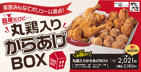エバーアクションは、国内の「からやま」「からあげ 縁」「からあげ・とり弁 縁」で、お得な「丸鶏入りからあげBOX」の販売を1月22日に開始する。税別価格は、2021年にちなんで2021円。在庫がなくなり次第、終了となる。