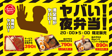 松屋フーズは、とんかつ専門店「松のや・松乃家」で1月27日20時から「ヤバい夜弁当」を発売する。1月中旬から、松のや公式Twitterでフォロワーに投票方式のアンケートを実施。その中から390円の激安弁当から890円のボリューム満点弁当まで3種類を用意する。