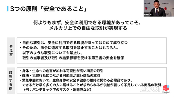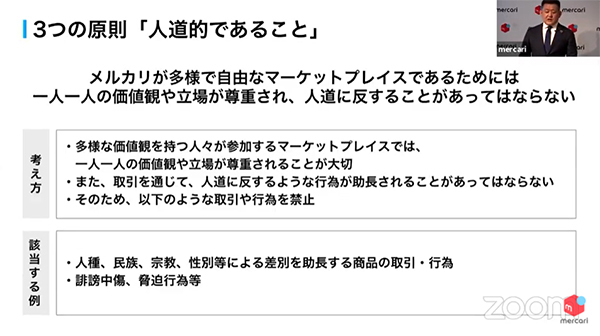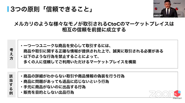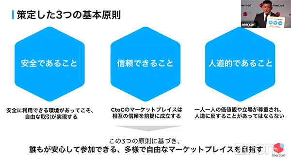 今回の方針は新たなルールの策定とは異なる。田面木CEOは「基本原則はマーケットプレイスに参加するすべての人に共有されるべき基本的な考え方。広く浸透させていくことが重要だ」とコメント。メルカリにとどまらず、競合となるプラットフォーマーとも連携していくと語った。