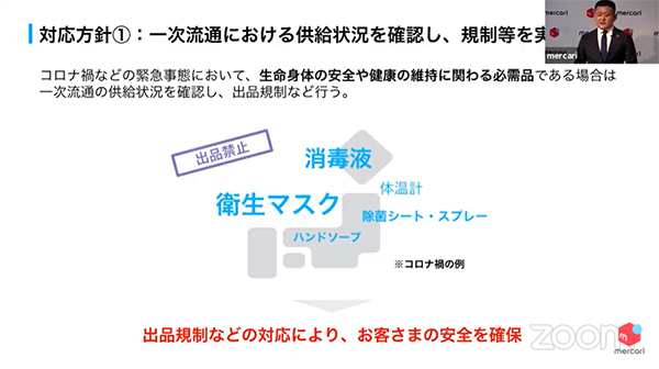 では、具体的にメルカリはどう動くのか。一つめに掲げたのは「一時流通の供給状況の確認と出品規制」だ。コロナ禍でいえば、マスクや消毒液、ハンドソープなどが顕著な例。「需給のバランスが著しく崩れているかどうか」を調査し、もし崩れているなら規制するということを明言した。