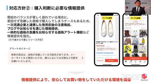二つめは「購入判断に必要な情報提供」だ。これは購入したいと思った商品が意図せず急騰していた場合のユーザー保護を目的とする。昨年のゲーム機の例では新品価格より中古価格が高いなどの現象が発生していた。メルカリは一次流通企業との連携や価格アラート機能を実装することで、これを防止したい考えだ。
