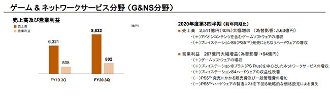 第3四半期(10~12月)の部門別業績は、ゲーム&ネットワークサービス分野(G&NS分野)の売上高が8832億円(40%増)となり、2511億円の大幅増収となった。ゲームソフトウェアの増収と、PS5の発売に伴うハードウェアの増収が大きかった。