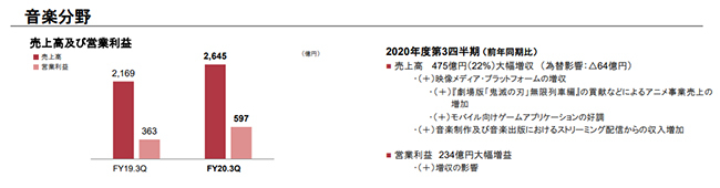 音楽分野も、2645億円(22%増)の売上高で好調。「劇場版『鬼滅の刃』無限列車編」などによるアニメ事業売上の増加や、モバイル向けゲームアプリの好調などが映像メディア・プラットフォームの増収につながった。また、音楽制作や音楽出版におけるストリーミング配信の増収も寄与した。