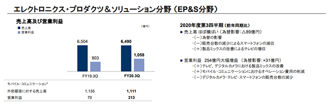 エレクトロニクス・プロダクツ&ソリューション分野(EP&S分野)の売上高は6490億円(0.2%減)で、ほぼ横ばいだった。製品ミックスの改善でテレビが増収に寄与した。