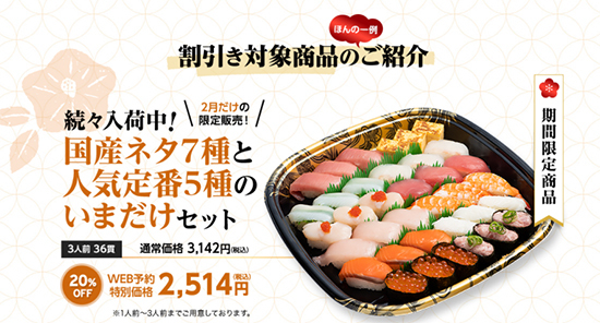 コロワイドグループのかっぱ寿司は2月4~28日の受取期間、ウェブやアプリからの注文限定で、対象のお持ち帰りメニューが20%オフになるキャンペーンを実施している。