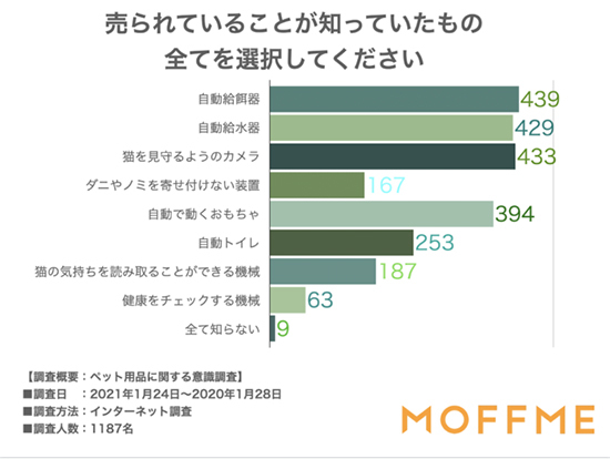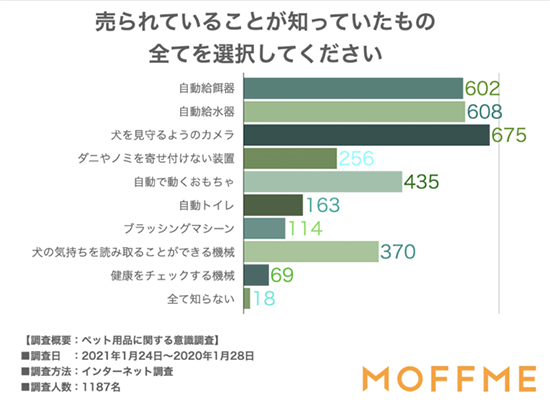ペット保険相談サービス「MOFFME」を運営するWizleapは、犬か猫を飼育している人を対象に「ペット用品・ペットテックに対する意識調査」を実施し、その結果を発表した。