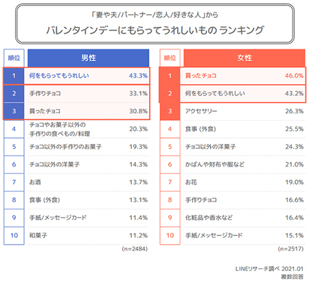 バレンタインデーに恋人、好きな人、妻や夫、パートナーからもらったらうれしいものを男女別に聞いてみたところ、男女共通で「何をもらってもうれしい」「買ったチョコ」が上位となった。男性では2位に「手作りチョコ」、3位に「買ったチョコ」がランクインした。また、男性で注目したいのは4位、5位にランクインしている手作りの料理やお菓子。女性では「買ったチョコ」が1位となり、男性とは異なり「アクセサリー」、「かばんや財布や服など」などの食べ物ではないおくりものも上位となっている。