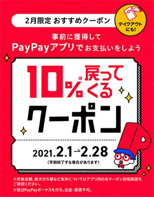 一方、PayPayクーポンは、PayPayアプリに実装されている機能で、ホーム画面の「クーポン」からアクセスする。事前に登録しておけば決済時に自動で適用される。2月は大手飲食チェーン(ケンタッキーフライドチキン、ココス、デニーズ、はなまるうどん、はま寿司、日高屋、松屋、吉野家など)が「10%戻ってくるクーポン」を配布中。ぜひこの機会に試してみてほしい。