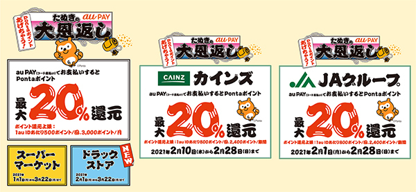 au PAYの2月の「たぬきの大恩返しキャンペーン」は、1月のスーパーに加えて、ドラッグストア、JAグループ、カインズも20%還元になる。還元上限はスーパー・ドラッグストア・カインズが1au IDあたり500ポイント/回、3000ポイント/期間、JAグループが1au IDあたり800ポイント/回、2400ポイント/月。