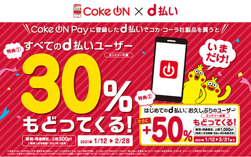 また、2月28日まで実施する「Coke ON Pay d払いで+30%戻ってくるキャンペーン」も実施中。Coke ON Payの支払設定にd払いを登録した上で、Coke ON Pay対応自動販売機で「Coke ON Payアプリ」からコカ・コーラ製品を購入すると、通常付与するポイントに加え、期間中500ポイントを上限に決済金額の30%相当のdポイント(期間・用途限定)を進呈する。