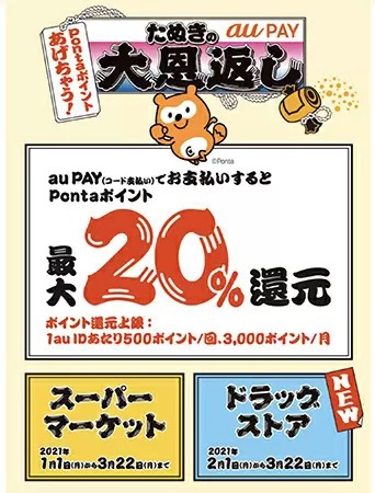 KDDIは1月1日から3月22日まで、スーパーをはじめとする対象店舗でスマートフォン(スマホ)決済サービス「au PAY(コード決済)」で決済すると最大20%のPontaポイントを還元する「たぬきの大恩返し」キャンペーンを実施している。