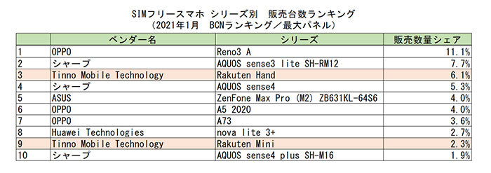 シリーズ別の販売台数ランキングでは、OPPOの「OPPO Reno3 A」がトップ、それに続くのがシャープの「AQUOS sense3 lit」。3位には先述したTinno Mobile Technologyが12月に発売した「Rakuten Hand」がランクイン。同社製のスマホ「Rakuten Mini」も9位に入るなど健闘している。キャリア主導の端末が今後どれだけユーザーに支持されていくのか。2021年のSIMフリースマホ市場における新しい注目ポイントになりそうだ。(BCN・大蔵 大輔)