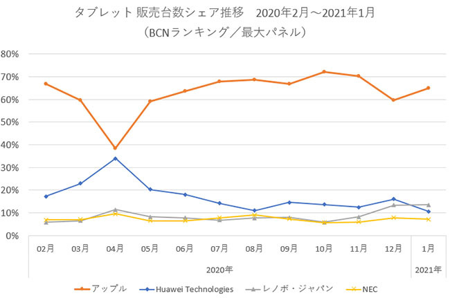 メーカー別の販売台数前年同月比は、アップルが120.7%、ファーウェイが77.9%、レノボが165.8%、NECが129.5%。販売台数シェアではアップルが6割超と圧倒的だが、競合各社も成長率は高い。また、1月のデータではこれまで2番手だったファーウェイをレノボが抜いたことも注目に値する。