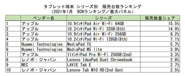 シリーズ別の販売台数シェアランキングでは、iPad Air Wi-Fi 64GBがトップを獲得。3万円台の第8世代iPadより単価は高いながら、高い支持を獲得している。Androidでファーウェイの「MediaPad T5」「MediaPad M5 lite」、NECの「LAVIE Tab E」、Chrome OSでレノボの「IdeaPad Duet」が売れ筋になっている。(BCN・大蔵 大輔)
