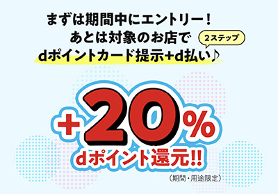 - 「いつでも二重ドリ d払い+20%還元キャンペーン」=https://service.smt.docomo.ne.jp/keitai_payment/campaign/dpay_tokutoku/2102/cpn_20.html