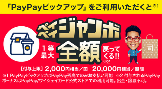 地域を選ばないキャンペーンでは、「PayPayピックアップ」を対象にした最大全額還元のペイペイジャンボが開催されている。内訳は、1等が100%、2等が10%、3等が1%還元。還元上限は2000円相当/回、2万円相当/期間。期間は3月31日までとなる。