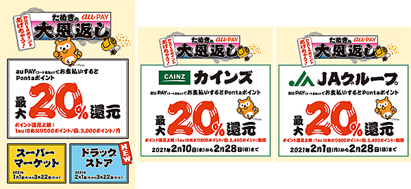 地域限定以外では、「たぬきの大恩返しキャンペーン」に注目。スーパー・ドラッグストア、JAグループ、カインズで20%還元になるキャンペーンを開催している。還元上限は、スーパー・ドラッグストア・カインズが1au ID当たり500ポイント/回、3000ポイント/期間、JAグループが1au IDあたり800ポイント/回、2400ポイント/月。