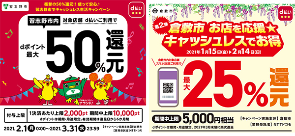 d払いも、地域限定キャンペーンに積極的だ。「衝撃の50%還元!!使って安心♪習志野市でキャッシュレス生活」キャンペーンが話題だが、岡山県倉敷市での最大25%還元、大阪府寝屋川市での10%還元など全国各地で同様のキャンペーンを開催している。また、マイナポイント事業と連携するものなど、内容はさまざまだ。