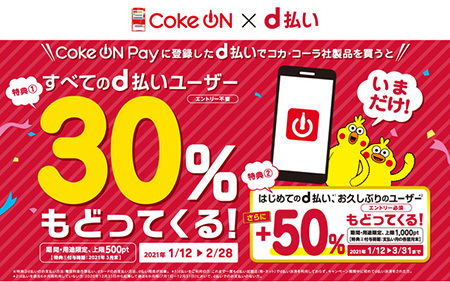 誰でも使えるキャンペーンには、「はじめてのd払い!今ならお久しぶりも!+50%還元キャンペーン」や「Coke ON Pay d払いで+30%戻ってくるキャンペーン」などがある。条件付きながら還元率は高いので、該当するユーザーはぜひ利用してみてほしい。