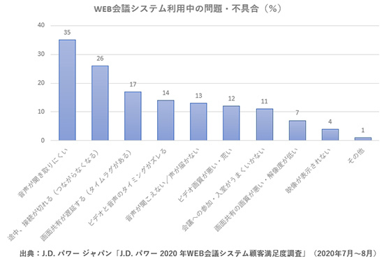J.D. パワー ジャパンが昨年夏に調査した「J.D. パワー 2020年WEB会議システム顧客満足度調査」によると、「WEB会議システム利用中の問題・不具合」で最も多かったのは「音声が聞き取りにくい」で35%。次いで、「途中、接続が切れる(つながらなくなる)」で26%だった。
