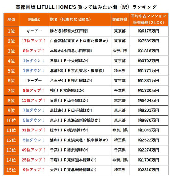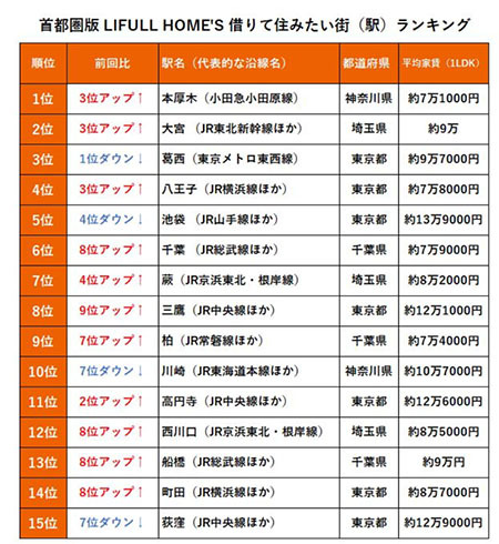 対照的に、前回まで4年連続1位の「池袋」が5位に後退したのを始めとして「川崎」(3位から10位)、「三軒茶屋」(6位から16位)、「吉祥寺」(9位から18位)など、都心周辺の人気エリアが軒並みランクダウンとなった。