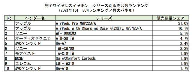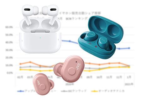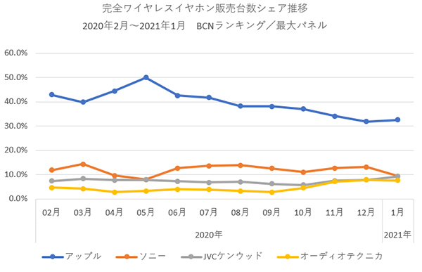 21年1月の販売台数シェアでも、アップルは直近1年で20年5月の50.0%をピークに徐々に低下している。2番手のソニーも、最新月では3位のJVCケンウッドと0.1ポイント差にまで詰まっている。