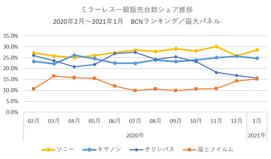 全国の家電量販店やECショップでPOSデータを集計する「BCNランキング」によると、2021年1月のミラーレス一眼デジタルカメラの販売台数は、前年同月比61.1%と大きく後退した。12月の年末商戦は70.4%と大きく落ち込んだが、それをさらに下回る結果となった。例年であれば新生活商戦や春節のインバウンドで潤う市場だが、新型コロナウイルス感染拡大に伴う緊急事態宣言が長引いている影響で、身動きがとれずにいる。