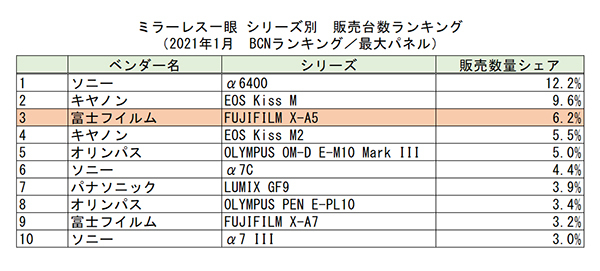 シリーズ別の販売台数シェアランキングでは、メーカーシェアを反映するように、ソニーの「α6400」がキヤノンの「EOS Kiss M」を逆転。期待の「EOS Kiss M2」を上回ったのが富士フイルムの「FUJIFILM X-A5」。小型・軽量モデルながら高いコスパ機として支持を拡大している。(BCN・大蔵 大輔)