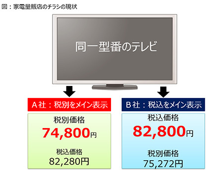 図は、家電量販店のチラシ価格表示を例にしたものだが、現状は、企業によって税別価格と税込価格の目立たせ方が異なっているのがわかる。