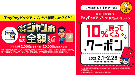 現在、PayPayは「PayPayピックアップ」を対象にした最大全額還元のペイペイジャンボが開催中。内訳は、1等が100%、2等が10%、3等が1%還元。還元上限は、2000円相当/回、2万円相当/期間。期間は3月31日まで。また、昨年から導入している新機能「PayPayクーポン」も見逃せない。2月は、大手飲食チェーン(ケンタッキーフライドチキン、ココス、デニーズ、はなまるうどん、はま寿司、日高屋、松屋、吉野家など)が「10%戻ってくるクーポン」を配布している。