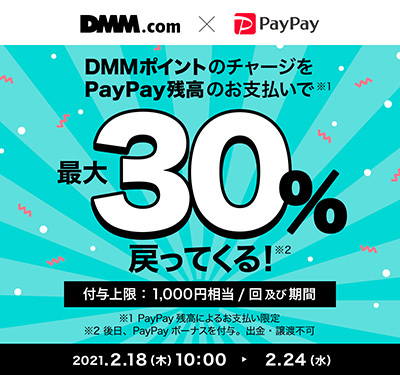 最大30%という高還元が魅力なのが、DMM.comとのコラボキャンペーン。2月18日から実施しており、PayPay残高でDMMポイントをチャージすると30%が還元される。還元上限は、1000円相当/回・期間。2月24日までと終了時期が早いので、気になる人はチャージだけでも済ませておこう。