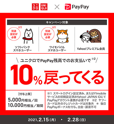 「Yahoo!プレミアム会員」もしくはソフトバンク・ワイモバイルのスマホユーザー限定でお得なのが、ユニクロとコラボしたキャンペーン。最大10%還元で、付与上限は5000円相当/回、1万円相当/期間と高く設定されている。ユニクロオンラインストアは、対象外となる点に注意したい。