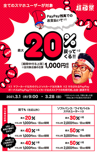 PayPayユーザーがマストで押さえておきたいのが、3月1日から開催される「超PayPay祭」だ。20%~50%還元になるビックチャンスで、PayPayに対応する全ての実店舗、ネットショップ、請求書払いが対応(一部対象外店舗は後日発表)。還元率はソフトバンク/ワイモバイルユーザーである場合や3月に新規登録した場合、半年間利用がない場合などに上がる仕組みだ。