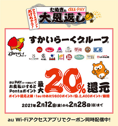 au PAYが実施している「たぬきの大恩返しキャンペーン」は、続々と対象店舗が広がっている。2月1日から対象になっていたスーパーやドラッグストア、JAグループ、カインズに加えて、2月12日にすかいらーく系列の店舗も仲間入り。日用品の買い物から飲食まで幅広く使える。