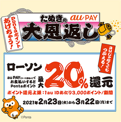 また、23日からは対象店舗にローソンも追加。対象となるのは、ローソン(ローソン・スリーエフ、ローソン・ポプラ含む)、ナチュラルローソン、ローソンストア100。期間は3月22日まで。還元されるPontaポイントは、4月上旬までに加算される。還元上限は、1au ID当たり3000ポイント。