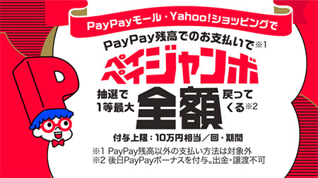 PayPayが1月12日からPayPayモールとYahoo!ショッピングで開催している決済金額の最大100%が戻ってくる「ペイペイジャンボ」は2月28日まで。くじの内訳は1等が100%、2等が10%、3等が2%還元で、還元上限は10万円/回・期間。