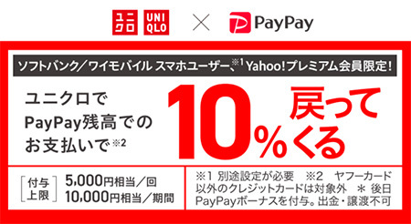 ソフトバンク・ワイモバイルユーザー・Yahoo!プレミアム会員なら、ユニクロでPayPay残高による決済が10%戻ってくるキャンペーンに注目。還元上限は5000円相当/回、1万円相当/期間。こちらも28日終了予定だ。