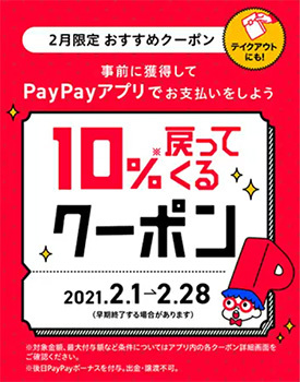 PayPayが昨年秋から実装している「PayPayクーポン」も2月末までのお得なクーポンを配布中。対象は大手チェーン飲食店で最大10%還元や100円付与など、条件はそれぞれ。事前にアプリからクーポンを取得しておけば、決済時に自動で還元される仕組みだ。