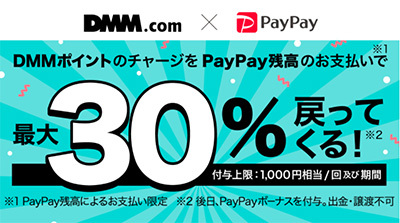 高還元でおすすめなのが、DMM.comとコラボしたキャンペーン。DMMポイントをPayPayでチャージすると最大30%戻ってくる。還元上限は1000円相当/回・期間。DMMポイントはエンタテインメントから通販まで幅広いカテゴリーで使用することができるので、これまで使ったことがない人はこれを機に始めてみるのもよいだろう。