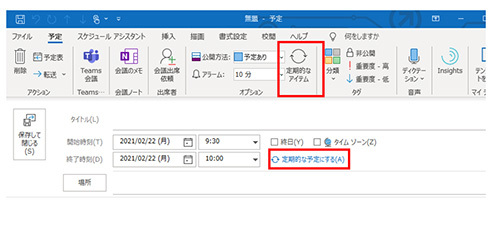 定例ミーティングなど、毎週決まった予定を登録する場合は「定期的なアイテム」を登録することで、毎週の予定をセットできる。